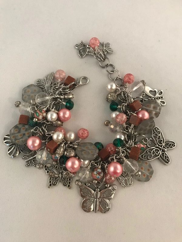This bracelet has been in the making for about a year. The base was made by me, a link at a time, I am very happy to have control over what size the links are and how well they are put together. It measures 9" from end to end, closes with a lobster clasp, and is adjustable. It is loaded with charms and beads. All the beads are wrapped rather than looped, which means that they won't be lost when you are wearing this bracelet!
